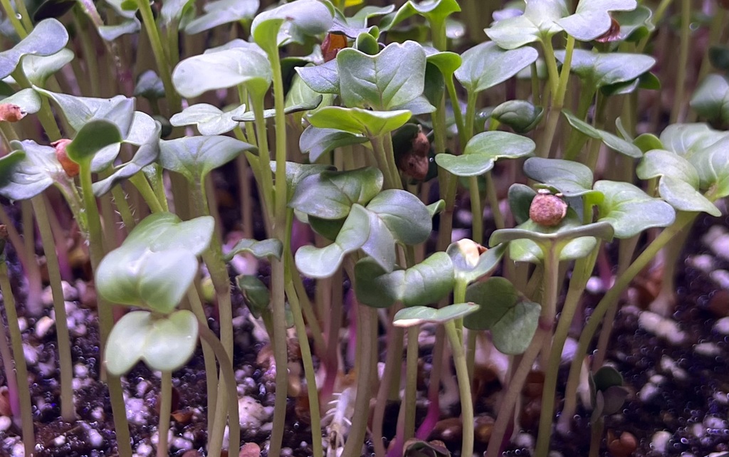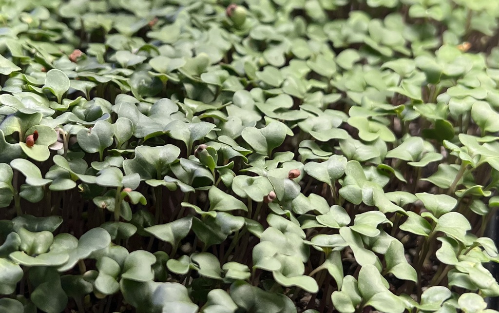 Radish microgreens are vibrant, tender greens with slender stems and heart-shaped leaves, often showing striking pink, purple, or red accents. Their flavour is bold and peppery, delivering a clean, spicy kick similar to a fresh radish but more refined and aromatic.